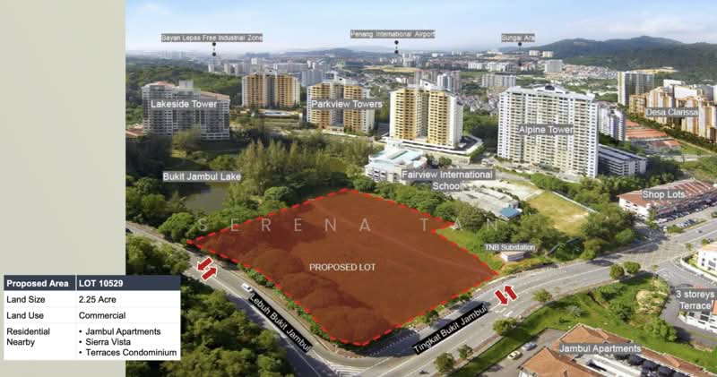 A parcel of development land located along Tingkat Bukit Jambul / Lebuh Bukit Jambul, within an established and matured township on Penang Island. The site is surrounded by residential neighbourhoods, educational institutions, and is within close proximity to Bayan Lepas, the airport and main arterial roads connecting to both bridges.The land measures approximately 97,900 sqft (≈2.247 acres) and is zoned for commercial use. The tenure is 99-year leasehold interest expiring on 4 April 2100. It also comes with approvals obtained for rezoning, planning and building plans, allowing a clearer pathway towards development.Based on the approved scheme, the site is intended for an integrated development comprising residential towers with supporting commercial and wellness components. The proposed development consists of approximately 629 units with a total gross floor area of about 1,194,000 sqft, offering a concept aligned with wellness living and lifestyle support.The asking price is RM48,000,000 (or nearest offer). The estimated gross development value is approximately RM408,000,000, subject to final approval upon submission of development plans.The location, surrounding catchment and existing approvals position the land as a viable opportunity for developers looking to enter or expand within the Penang Island market.