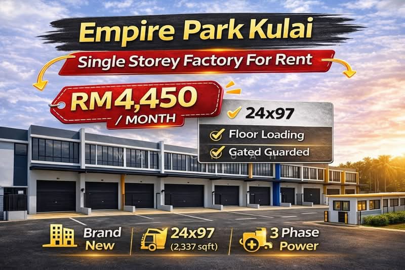 For Rent/ 出租古来全新保安围篱排厂|单层稀缺单位Ace Empire Park @ Kulai市面少有 24x97 单层排厂轻工业用途|马上可用Land size:24 x 97(2337 sqft)Build up:2270 sqft单层(好用好规划)朝南(通风好)地面承重:10kN/m²三相电(3 Phase)保安围篱(Gated & Guarded)位置优势:5分钟到 Kulai Toll直通南北大道工厂/物流/仓储都适合Rental:RM4,450重点:市场少有“单层 + 24x97”比1.5层更实用(不用上下搬货)May Chuah0*****No Co-broke unit