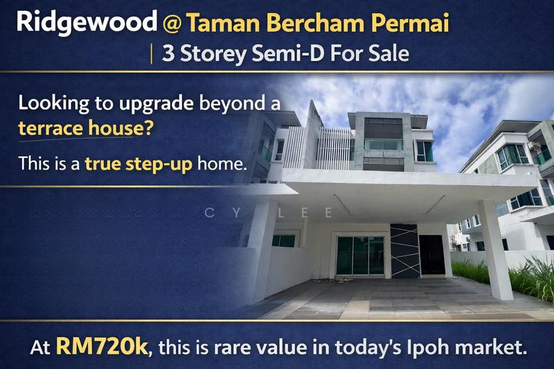 Looking to upgrade beyond a terrace house?This is a true step-up home.Freehold.Gated & Guarded.Low density.Brand new unit.At RM720k, this is rare value in today’s Ipoh market.Property DetailsRidgewood @ Taman Bercham Permai~ 35’ x 75’ (2,625 sqft land)~ 5+1 Bedrooms~ 5 Bathrooms~ Freehold~ Brand new, never occupied~ Facing North3 storey layout gives you flexibility for:• Multi-generation living• Home office / studio• Large family comfortStrategic LocationEasy access to:Ipoh Garden East | Ipoh Town | Sunway | Tambun | HighwayNearby amenities:AEON Kinta CityTesco & EconsaveBanksPetrol stationsSchools & kindergartenFood outlets & groceriesSelling Price: RM720,000Terrace houses are already approaching 600k in prime areas.A Freehold 3-storey Semi-D at this price offers strong long-term value.CY LEEE Trend Realty Sdn Bhd
