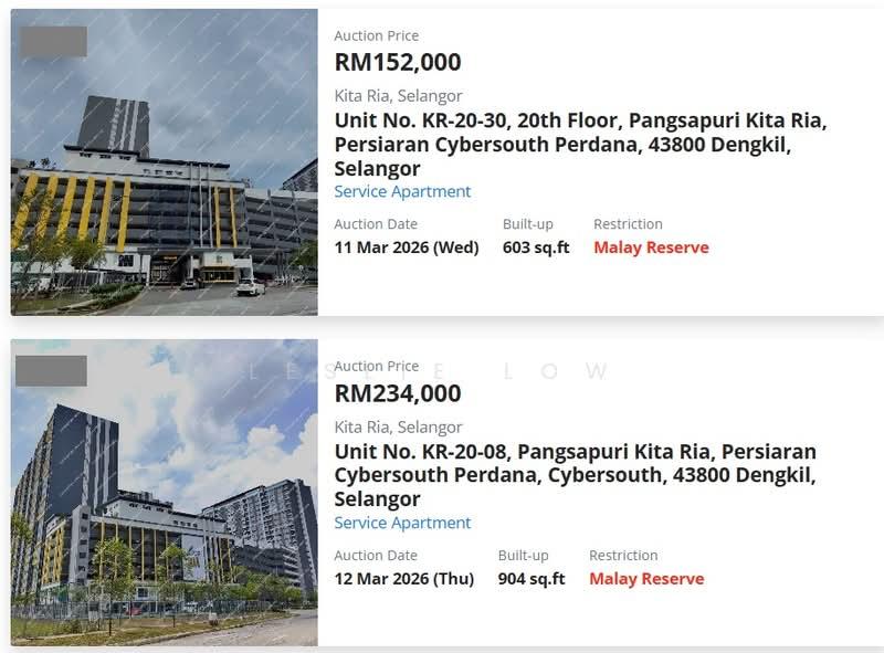 Bank Lelong ~ RIZAB MELAYU:Kita Ria @ CyberSouth, Cyberjaya / DengkilLuas: 603 ~ 904 kaki persegiHarga Lelong: RM152k ~ RM234kIkut alamat untuk melihat LUAR sahaja.Perlu sediakan 10% deposit sebagai wang pendahuluan.Ini adalah Lelong bidaan; siapa yang tawar paling tinggi dan terakhir, dialah yang menang.Hubungi Lelong King ~ LESLIE LOW O16 2O6 8O88