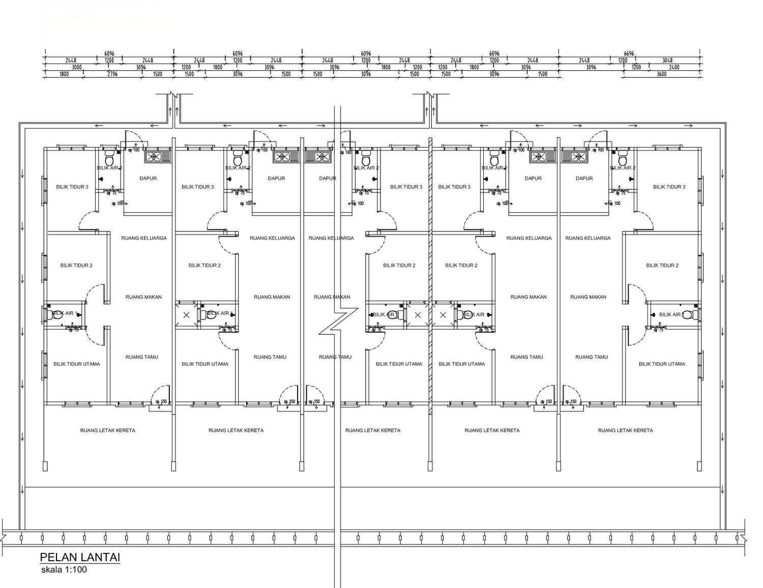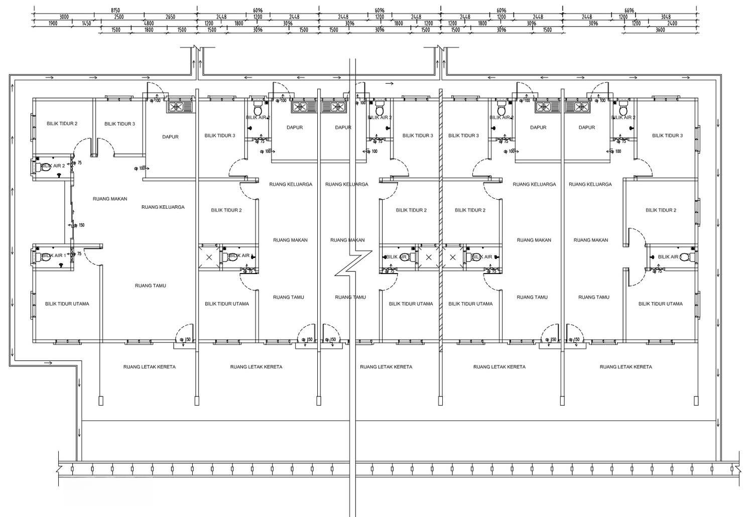 8 units of Type A single-storey terrace houses and 11 units of Type B single-storey terrace houses. Type A houses have reinforced concrete frames, brick walls with cement plaster, hardwood truss roofs with tiles, and asbestos sheet ceilings with paint finish. Flooring includes cement for parking, ceramic tiles for living, dining, kitchen, bathroom, and bedrooms. Wall finishes are ceramic tiles in kitchen and bathroom and cement plaster with paint in other areas. Doors are made of wood panels, PVC, and waterproof plywood. Windows are aluminum casement and aluminum louvers. Electrical points include 11 lamps, 5 ceiling fans, and 10 power points. Sanitary fittings include a sitting toilet, shower, and tap in one bathroom, and a squatting toilet, shower, and tap in the other. Other features are a 250-gallon water tank and a 5-foot high chain-link fence.